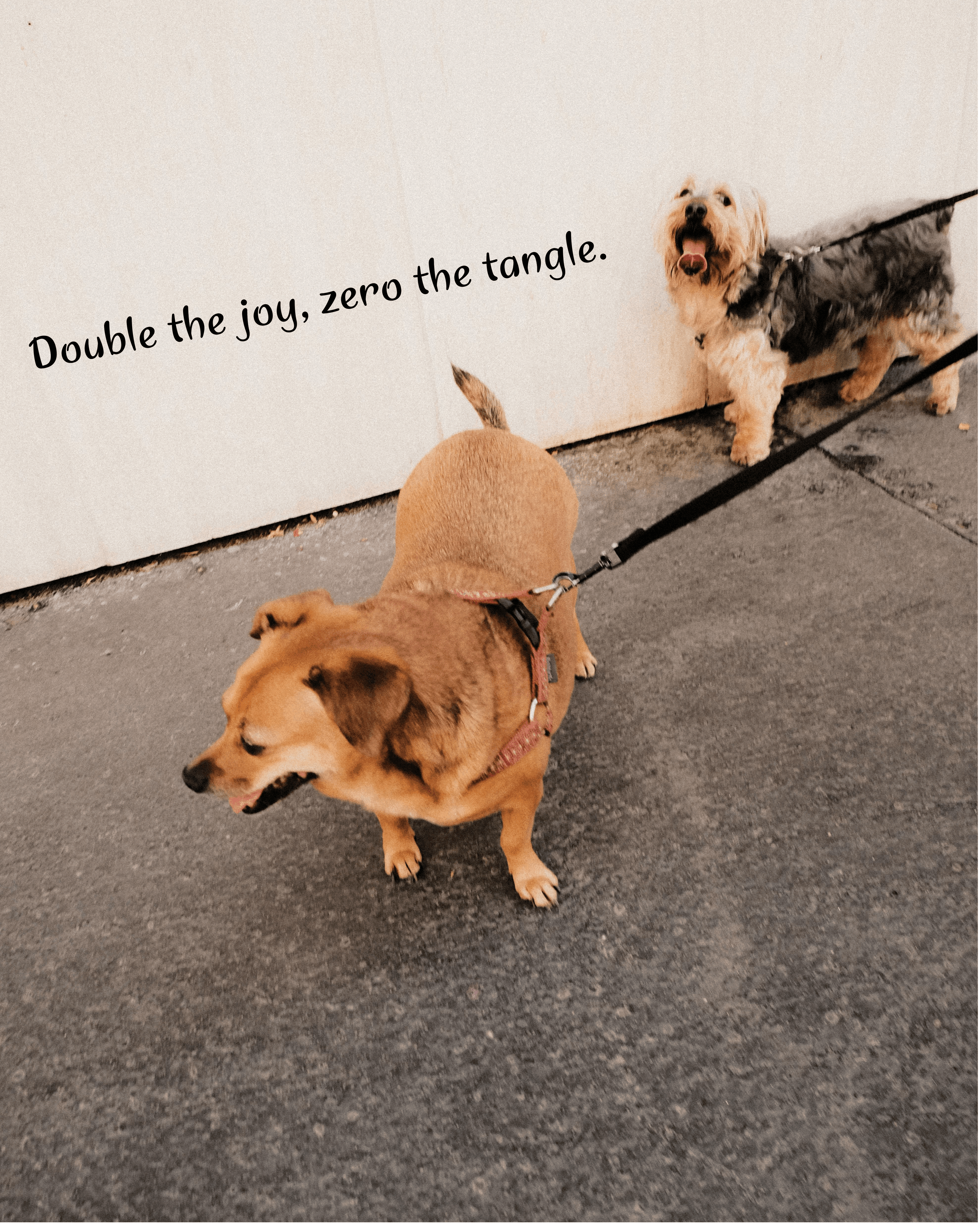 Engineered for multi-dog families, our Double Dog Leash features high-strength webbing and a 360° swivel to ensure freedom of movement for both your buddies.